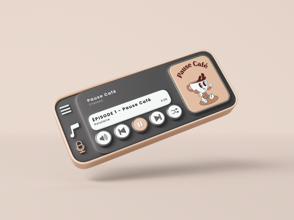 Dans le cadre d’un projet fictif, j’ai élaboré l’identité d’un podcast intitulé « Pause-Café ». Le concept est simple : se réunir autour d’un café et discuter de diverses thématiques. Un podcast chill que l’on peut écouter pendant notre pause.